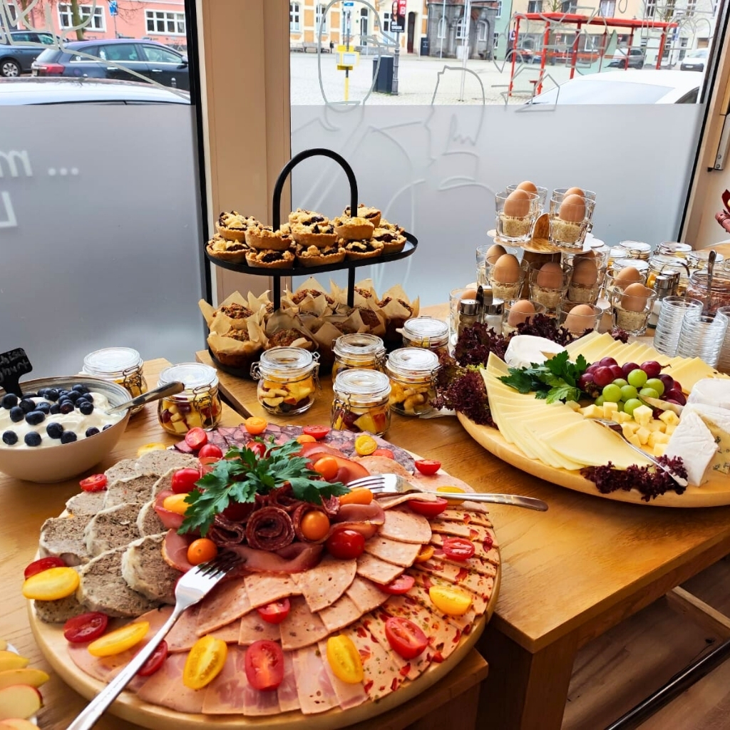 Wir haben konditorfrische Torten und Kuchen, verschiedene Eispezialitäten, Frühstück und wöchentlich wechselnde Mittagssnacks im Angebot.