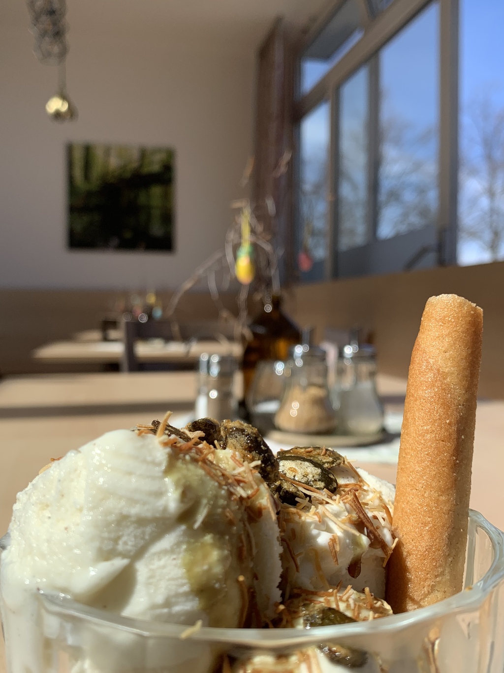 Je eine Kugel Haselnuss, Pistazie und Macadamia Salted Caramel, dazu Sahne,